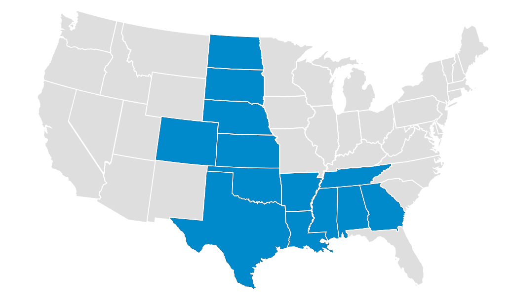 Alabama, Arkansas, Colorado, Georgia, Kansas, Louisiana, Mississippi, Nebraska, North Dakota, Oklahoma, South Dakota, Tennessee, and Texas